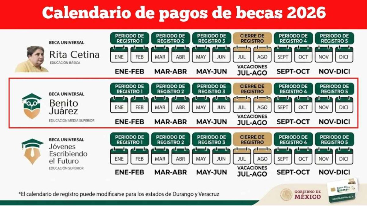 ¿Cuáles son las fechas principales del calendario de pagos de becas 2026?